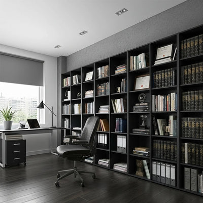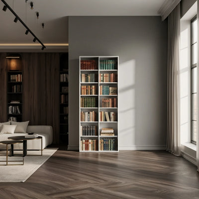 3 colunas = presença de verdade. Pra quem quer parede bibliográfica, curadoria exposta, acervo extenso.