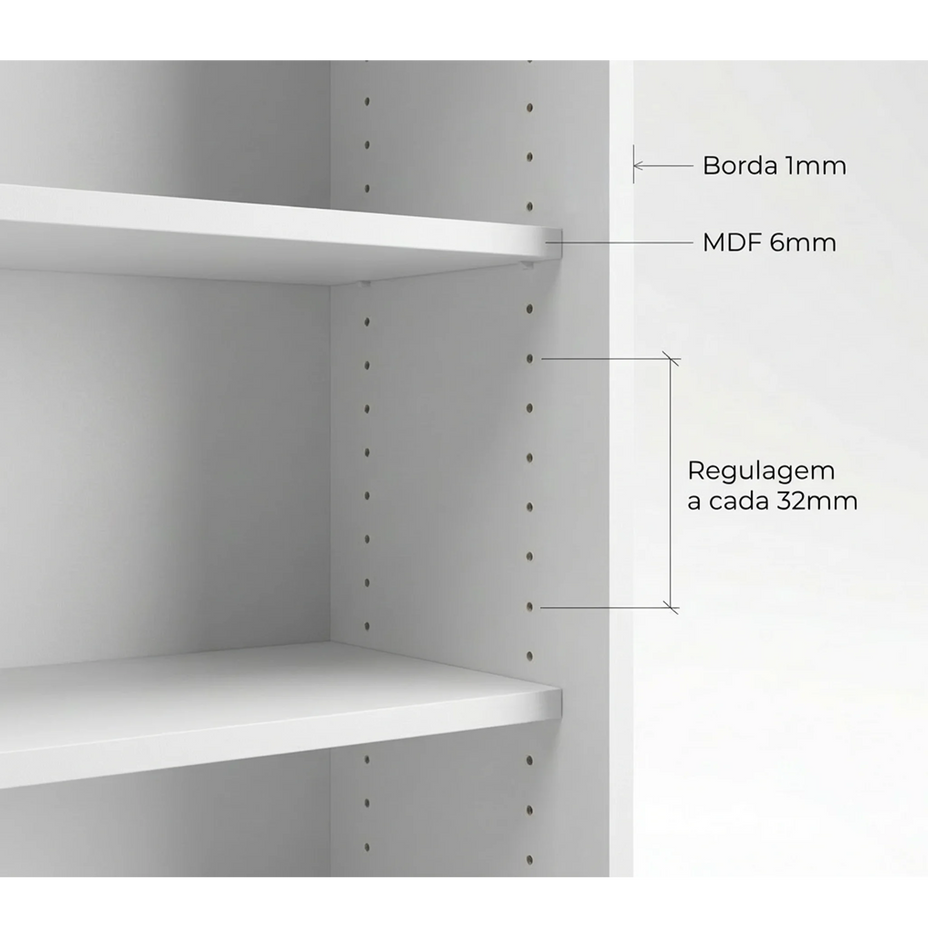 MDF grosso, borda reforçada e furação milimétrica a cada 32 mm para você mudar as prateleiras quando quiser.